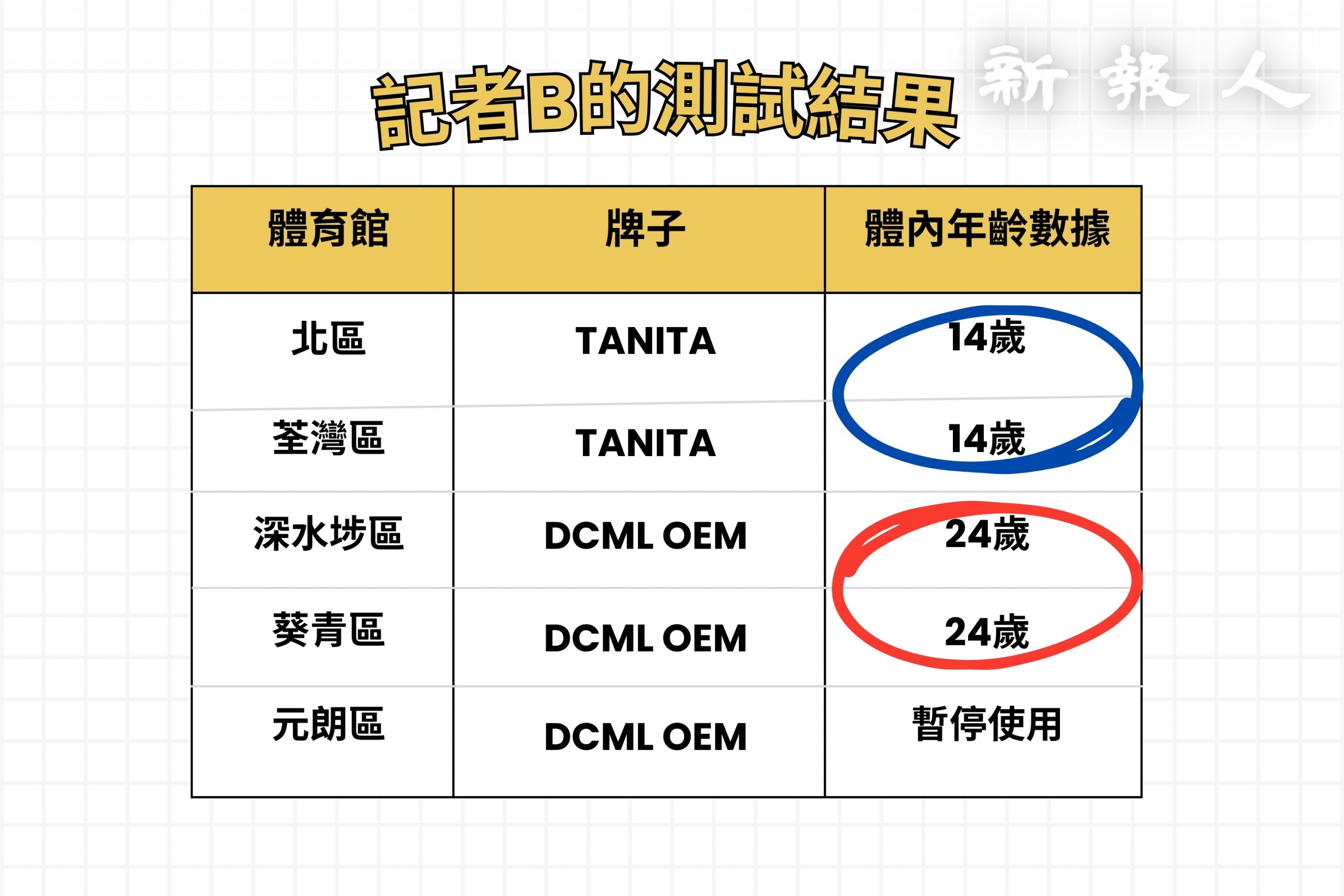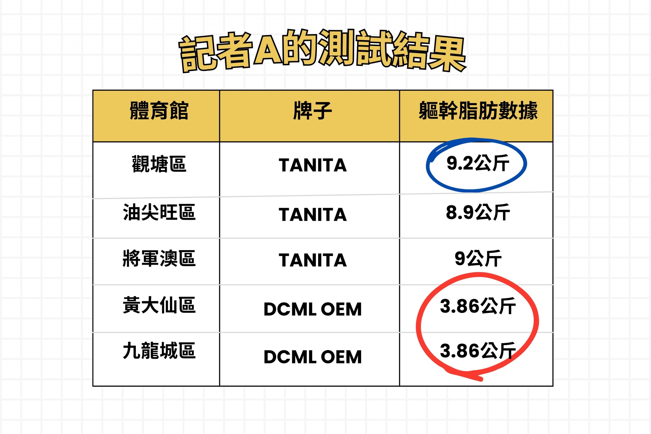 為了解體脂機實際操作及測試結果,本報兩位記者分別於同一天5小時內前往5間體育館測試10個區體脂機,期間沒有進食,僅飲用了少量的水,以盡量減少變數,除了一部體脂機未能運作,其餘都有測試結果。第一位記者「軀幹脂肪」數據相差最大,測量結果最低為3.86公斤,最高為9.2公斤,相差5.34公斤。第二位記者本身19歲,在不同區的體脂機「身體年齡」一項分別測出14歲與24歲的數據,相差10歲。