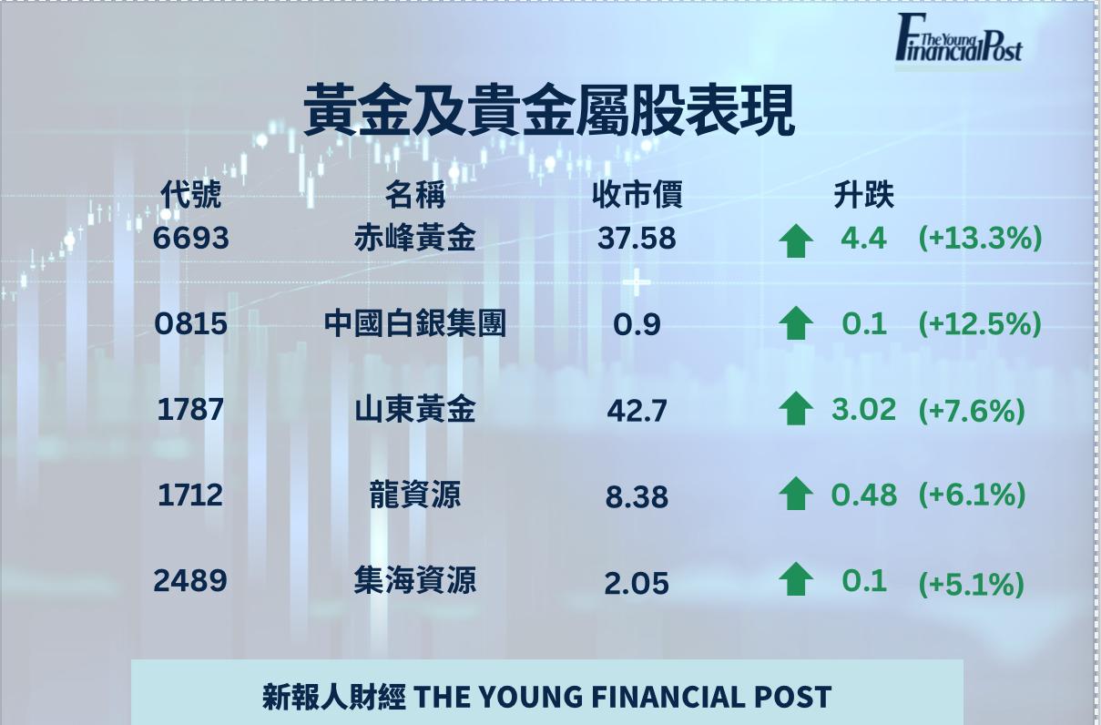 國際金價首次突破每盎司4000美元大關,金礦股今日逆市造好。貴金屬板塊整體走強,赤峰黃金(6693)收報37.58元,升4.4元或13.3%;中國白銀集團(0815)收報0.9元,升0.1元或12.5%。溫鋼城表示,金價受美元走勢直接影響,目前全球普遍憂慮美國的財政狀況與債務風險,部分國家也開始減持美債,市場預期全球對於黃金等傳統避險資產需求會進一步擴大,金礦股得以提前受惠。但認為金價在短期內會先有回調,拖低金礦股表現。不過他預期金價有望繼續升勢,明年有望升穿5000元,看好長線繼續帶動金礦類股份上升。