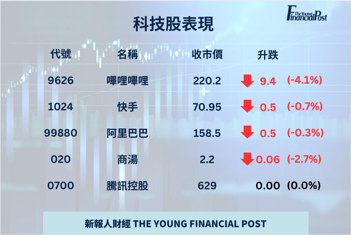 科網股受美國科技股拋售影響,普遍下跌,嗶哩嗶哩(9626)跌9.4元或4.1%,阿里巴巴跌0.5元或0.3%。張智威表示,人工智能概念被炒熱,但投資者現時普遍質疑企業持續大量投放資金於人工智能,卻未必能帶來相應回報,對人工智能概念股份過高的市盈率和估值產生憂慮,因此拖累整體科網板塊走勢。