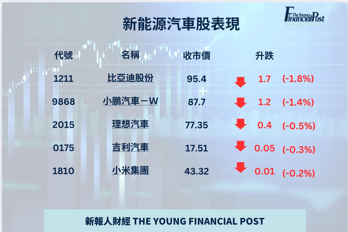 華為合作夥伴中國新能源車企賽力斯(9927)今掛牌上市,收報131.5元,與招股價一樣;新能源汽車板塊普遍下跌,比亞迪(1211)跌1.7元或1.8%,收報95.4元,創6個月新低;吉利汽車(0175)跌0.05元或0.3%,收報17.51元。張智威認為行業現時仍「內卷」,導致車企之間存在價格戰和技術競爭,研發支出增大,因此市場對汽車板塊的獲利能力仍有憂慮。