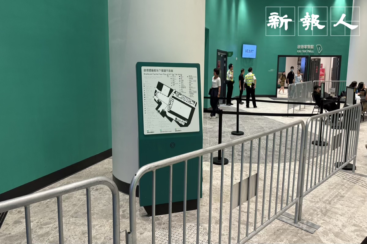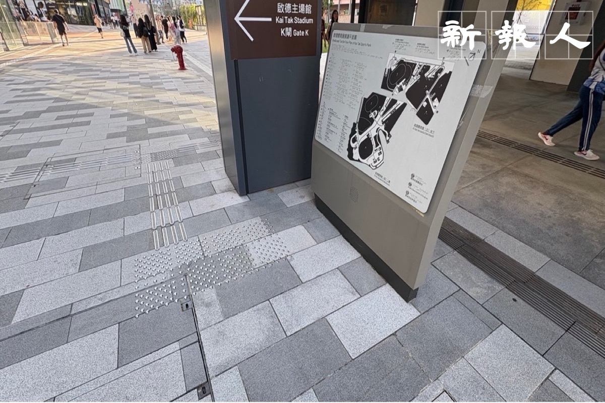 另外,記者在啟德實地視察期間發現,啟德體藝館正在舉行活動,館門外一旁的摸讀地圖被鐵馬阻擋,無法使用,且引導徑亦被阻擋。