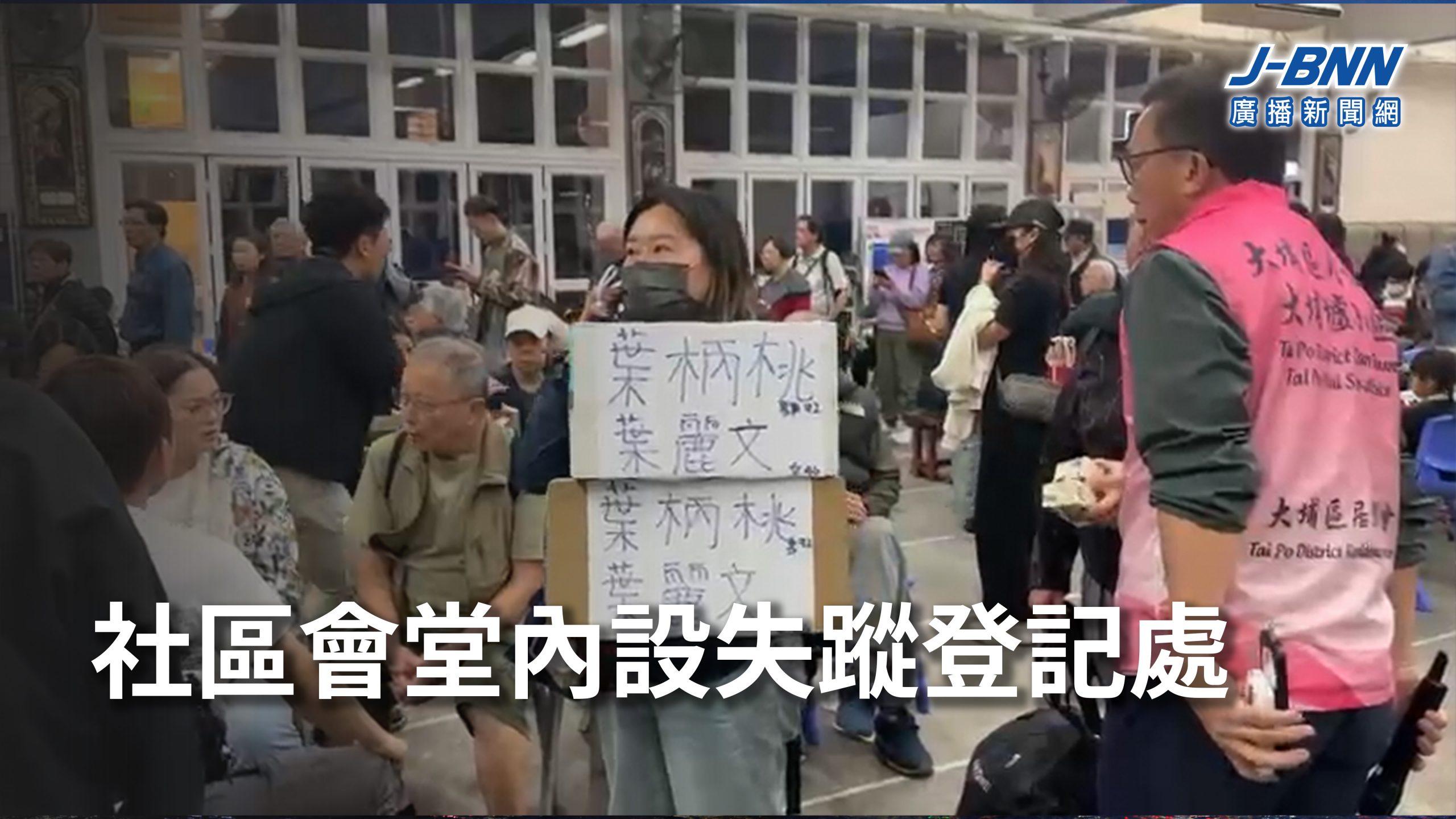 【18:40】居民陸續疏散至社區會堂,會堂內設失蹤登記處,現場有人排隊登記,有人手持寫有失聯親人名字的紙皮尋找家屬。