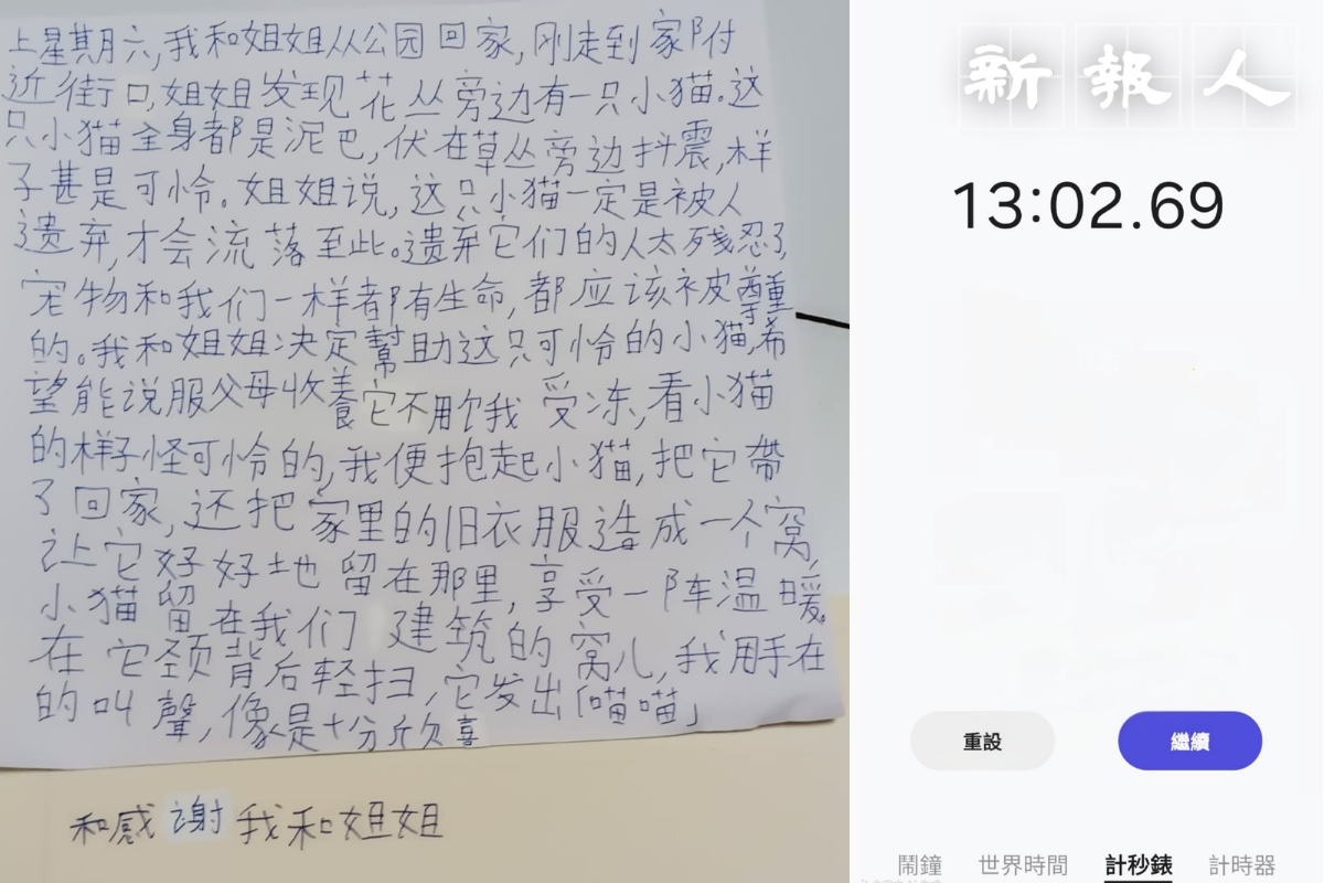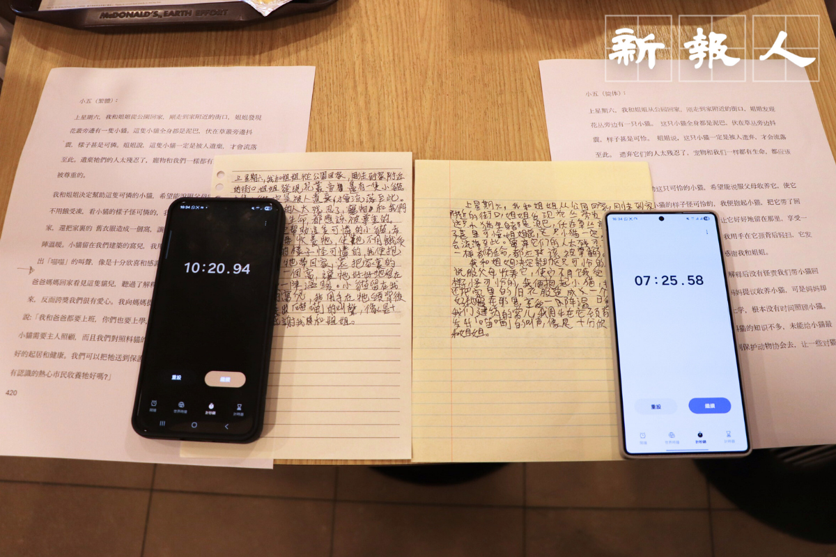 為了解書寫上的差異,《新報人》進行書寫速度比拼。在第一組測試中,分別邀請一位本地小五學生葉同學以繁體字,及一位新來港小五學生陳同學以簡體字抄寫一篇250字的文章。結果顯示,葉同學用繁體字抄寫耗時10分鐘20秒,而陳同學用簡體字僅需7分鐘25秒,兩者相差約3分鐘。這也是部分本地家長的憂慮,允許考試用簡體字,書寫字速度會有優勢。