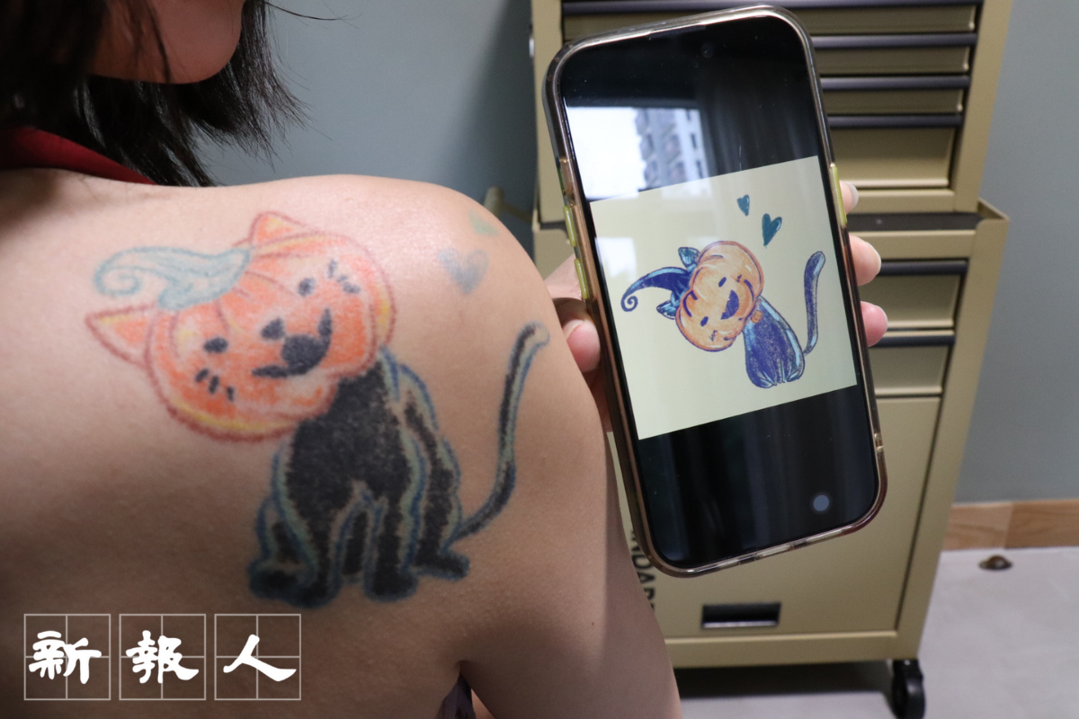 紋身可以盛載與親人的故事,亦可以訴說對毛孩的寵愛。大學生黃小姐,背上是她飼養的貓肖像。她稱這個貓咪紋身是送給自己的生日禮物,將貓咪可愛一面記在身。