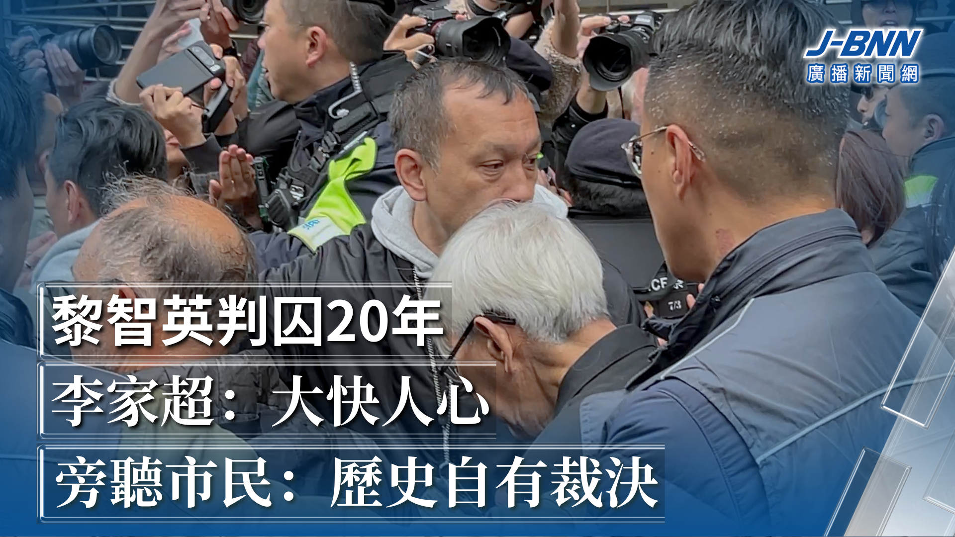 壹傳媒創辦人黎智英涉勾結外國勢力。還押5年後於今早判刑,被判20年,當中18年與另一宗欺詐罪分期執行。同案的8名被告分別被判六至十年。