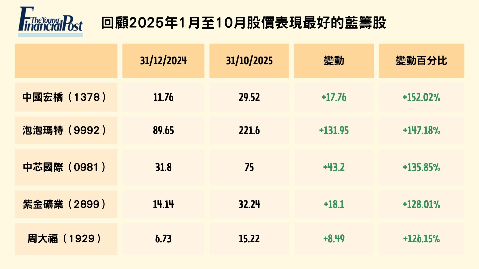 個股表現方面,2025 年首十個月表現較好的五隻藍籌依次為中國宏橋 (1378)、泡泡瑪特 (9992)、中芯國際 (0981) 、紫金礦業 (2899)、 周大福 (1929)。根據Deepseek 和 ChatGPT 的歸納,表現最好藍籌是中國宏橋 (1378),股價累計升幅約 1.52 倍,兩個模型均指出主要受惠於鋁業基本面改善及需求激增。DeepSeek 補充供應受限及美聯儲降息預期進一步推高鋁價與板塊情緒,推高股價。泡泡瑪特(9992) 排第二 ,股價累計升幅約 1.47 倍,第三季營收年增 2.45 至 2.5 倍。ChatGPT 指升勢主要來自投資者上調對其品牌與消費業務增長的估值水平,第三季線上及海外營收強勁,使市場重新定價,但股價期間亦受大市波動拖累。DeepSeek 則強調股價核心動力在於 IP 全球化及業績爆發式增長,並受名人效應及政策推動潮玩消費,吸引資金持續流入。第三的中芯國際 (0981) 累計升幅近1.35 倍。兩個模型均提到,受惠於中國半導體自主化與國產替代趨勢,政策推動使其在板塊走強中受益。