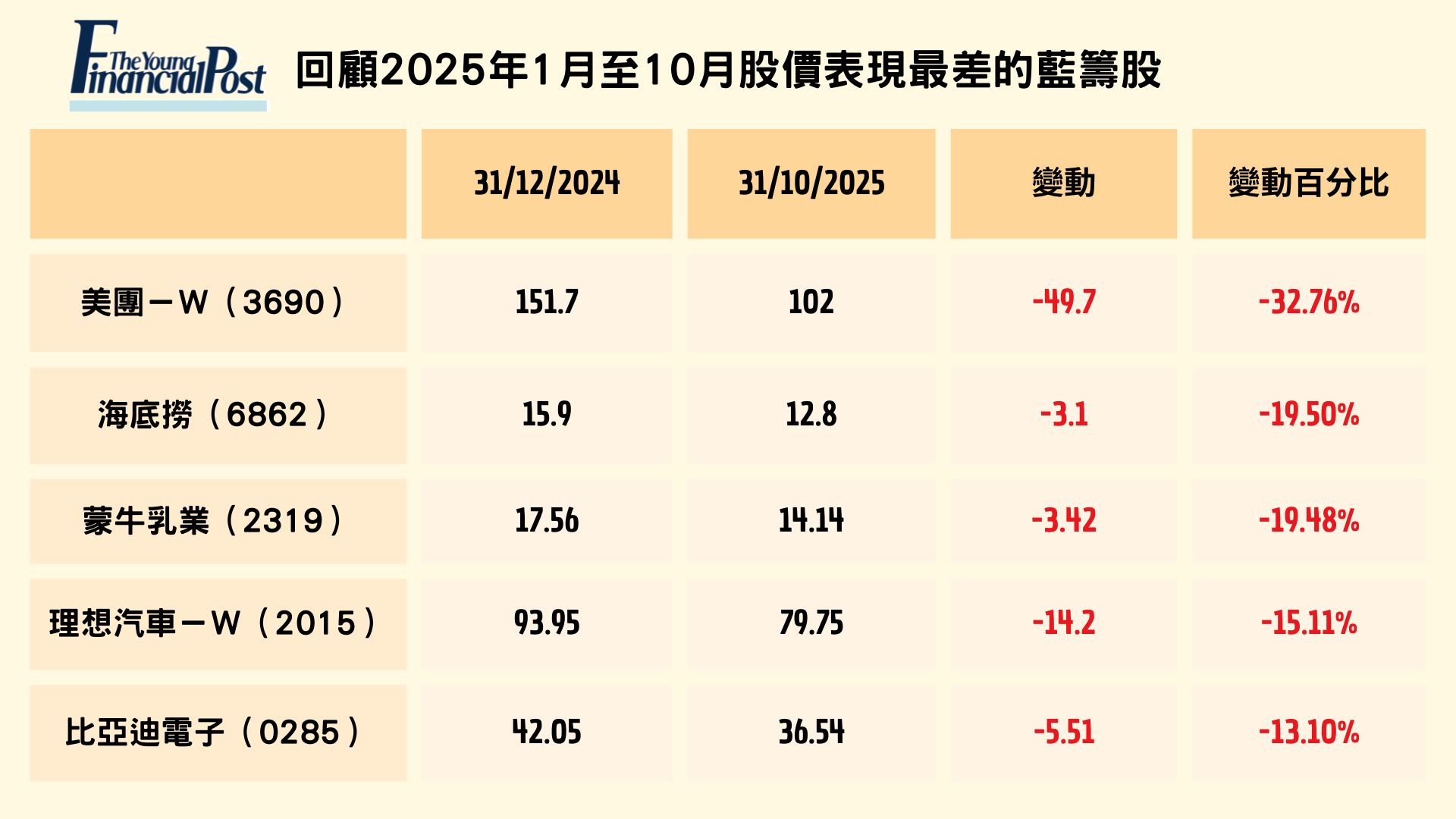 2025 年首十個月股價表現最弱的藍籌包括美團 - W (3690)、海底撈 (6862)、蒙牛乳業 (2319) 、理想汽車-W (2015) 及比亞迪電子 (0285)。美團-W (3690) 成為跌幅最大的藍籌股,累計跌幅約 33%,兩個模型均表示,美團股價回落與外賣及即時零售競爭加劇,以及市場對增長放緩的關注相關。ChatGPT 指出平台補貼力度及相關成本、現金流表現引起投資者對其盈利能力及長線回報的審慎評估。而海底撈(6862)股價同期跌近兩成,兩個模型均指出,海底撈股價表現與線下消費復甦力度未如預期及餐飲行業競爭加劇的市場環境相關,翻枱率及同店增長亦備受關注。DeepSeek 則補充宏觀消費環境波動對經營表現構成挑戰,相關因素令股價持續受壓。股價同樣下跌近兩成的蒙牛乳業 (2319) ,兩個模型均提到,蒙牛乳業的股價表現與消費需求偏弱及市場對行業前景的審慎情緒相關。ChatGPT 指公司 2025 年中期純利及營收同比下滑,大行亦下調銷售預測,市場對其收入增長保持謹慎;DeepSeek 則補充乳製品行業面對原奶價格波動及競爭加劇,宏觀消費疲軟仍主導板塊情緒。