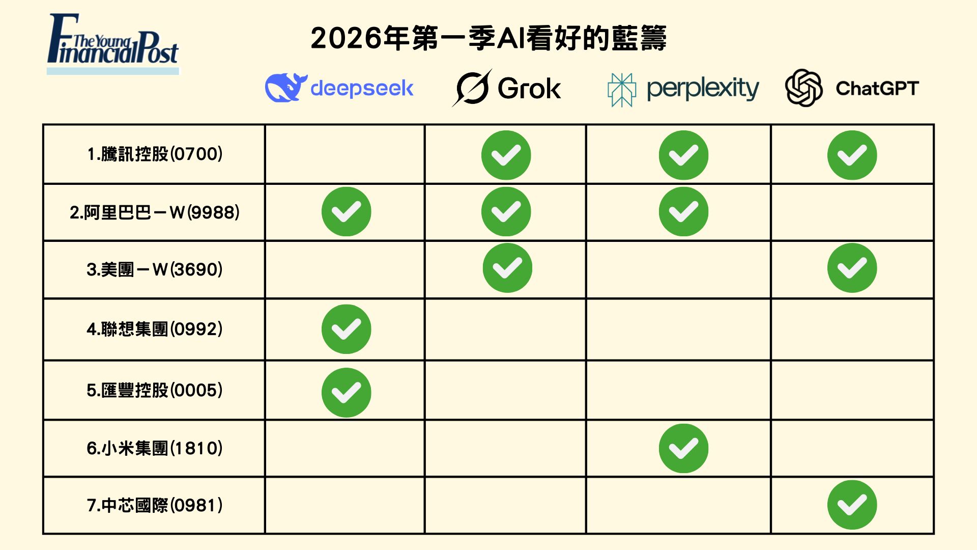 展望新一年,記者也分別使用市面常見的AI模型包括DeepSeek、Grok、 ChatGPT 以 及 平 台Perplexity 的自主模型,要求他們根據最新的即時市場資訊,預測在 2026 年第一季表現最好的三隻藍籌股並附上理由。綜合四大 AI 模型的分析,科技類股份成為 AI 共同看好的。其中,騰訊控股(0700)與阿里巴巴 -W(9988)是獲最多 AI 共同看好的股份;美團 -W(3690)則獲兩個模型青睞。七隻被AI 提及的籃籌股中,六間公司都與科技以及人工智能領域相關。