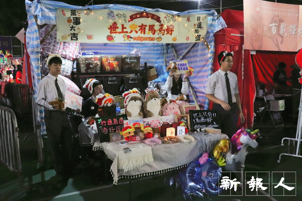 維園年宵乾貨檔,部分是學生擺檔,有以馬仔做主題,亦有產品是自家設計。中學生檔主李同學是第二年擺攤,因下年為馬年,檔名取其寓意「世上只有馬馬好」。他汲取上年擺檔的經驗,發現動物公仔更熱門,所以其檔位售賣動物公仔及手工品。手工品由學校低年級的學生設計,再找生產商製造。李同學指,雖然今年年宵首日的銷情一般,但相信周末維園的人流增加,將提升顧客消費欲,希望對生意會有幫助。