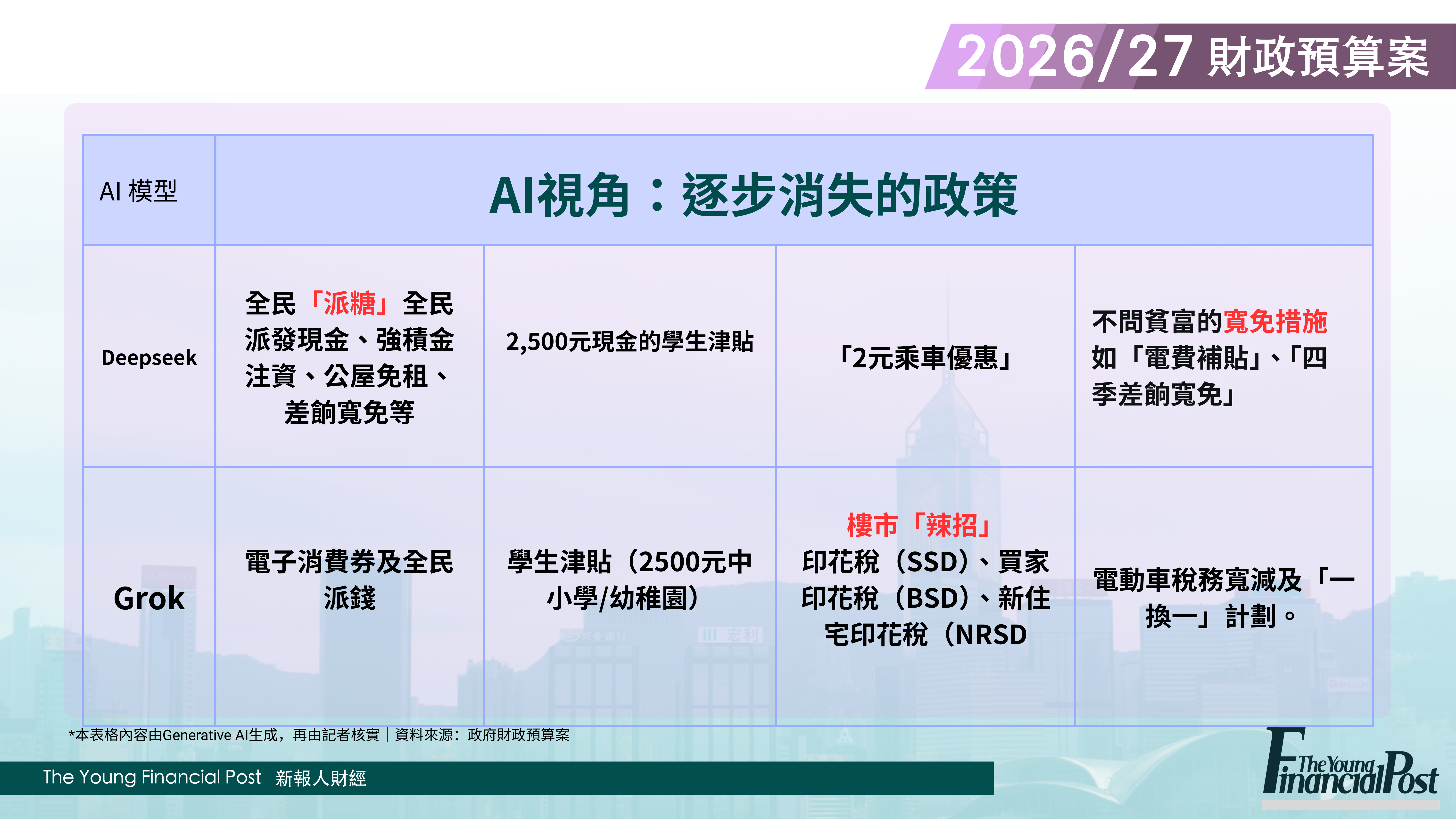 在政策的變化上,兩個AI模型均提及「派錢」、消費券的政策不再,又提及學生津貼政策消失了。DeepSeek的其他回答涵蓋2元乘車優惠和不同階層的寬免措施等,例如針對基層的電費補貼以及針對中層的四季差餉寬免等等;而Grok的回答則關注其他政策包括電動車稅務寬減及「一換一」計畫、樓市的遮辣招(包括額外印花稅(SSD)、買家印花稅(BSD)、新住宅印花稅(NRSD)的消失。