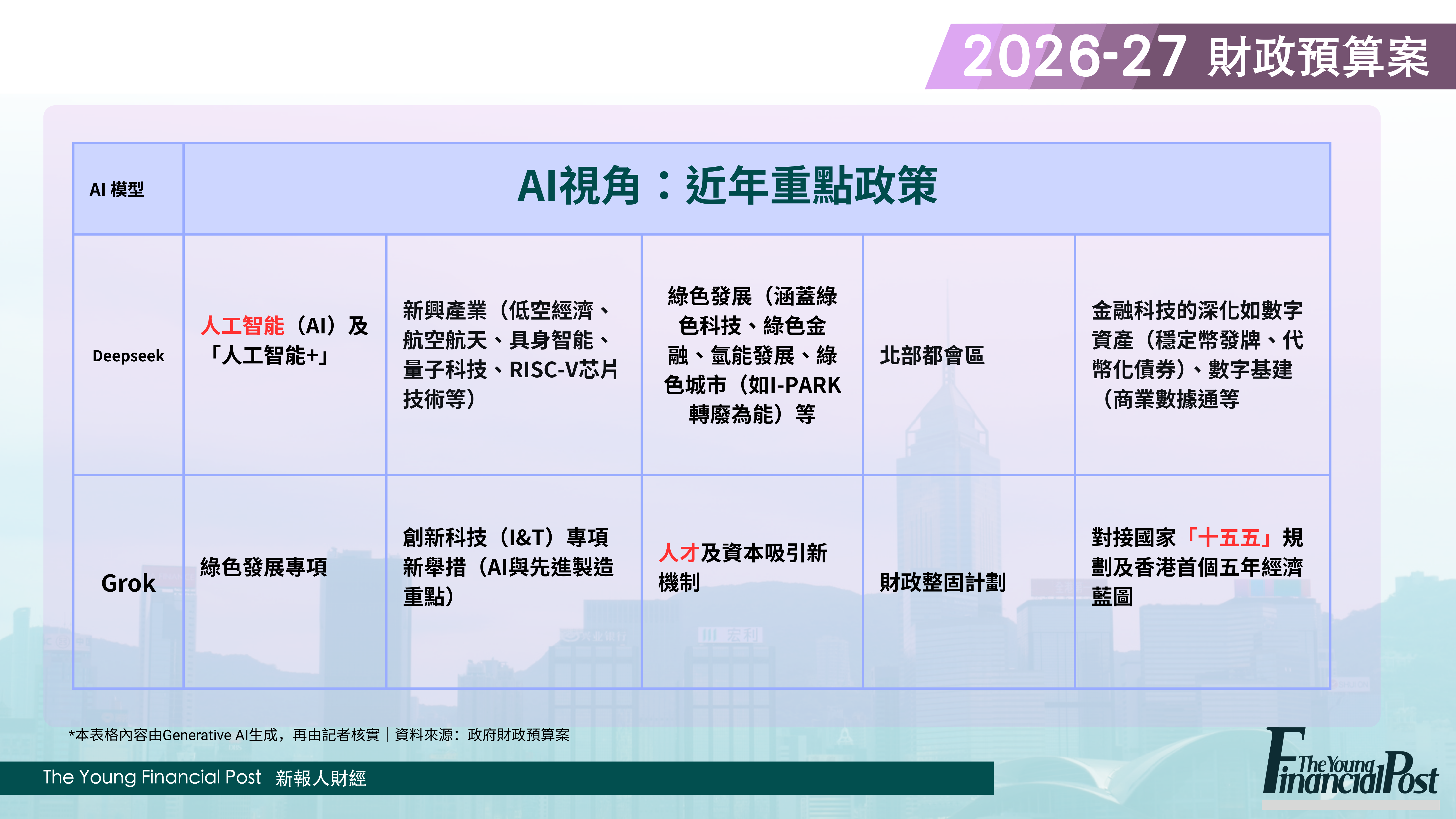 問及近年新興的熱點政策上,兩大AI模型都提及財政預算案對人工智能(AI )以及創新科技方面的培育和投資,當中Gork引述2025-2026年度的財政預算案,指出本港政府首次為香港人工智能研發院預留10億元投資款項,同時亦有留意對綠色發展的重點。Deepseek另外的關注政策包括金融科技、新興產業以及北部都會的發展;而Gork的回答則分析了對專才及資本吸引機制、國家「十五五」的規劃和財赤下的財政管理框架。