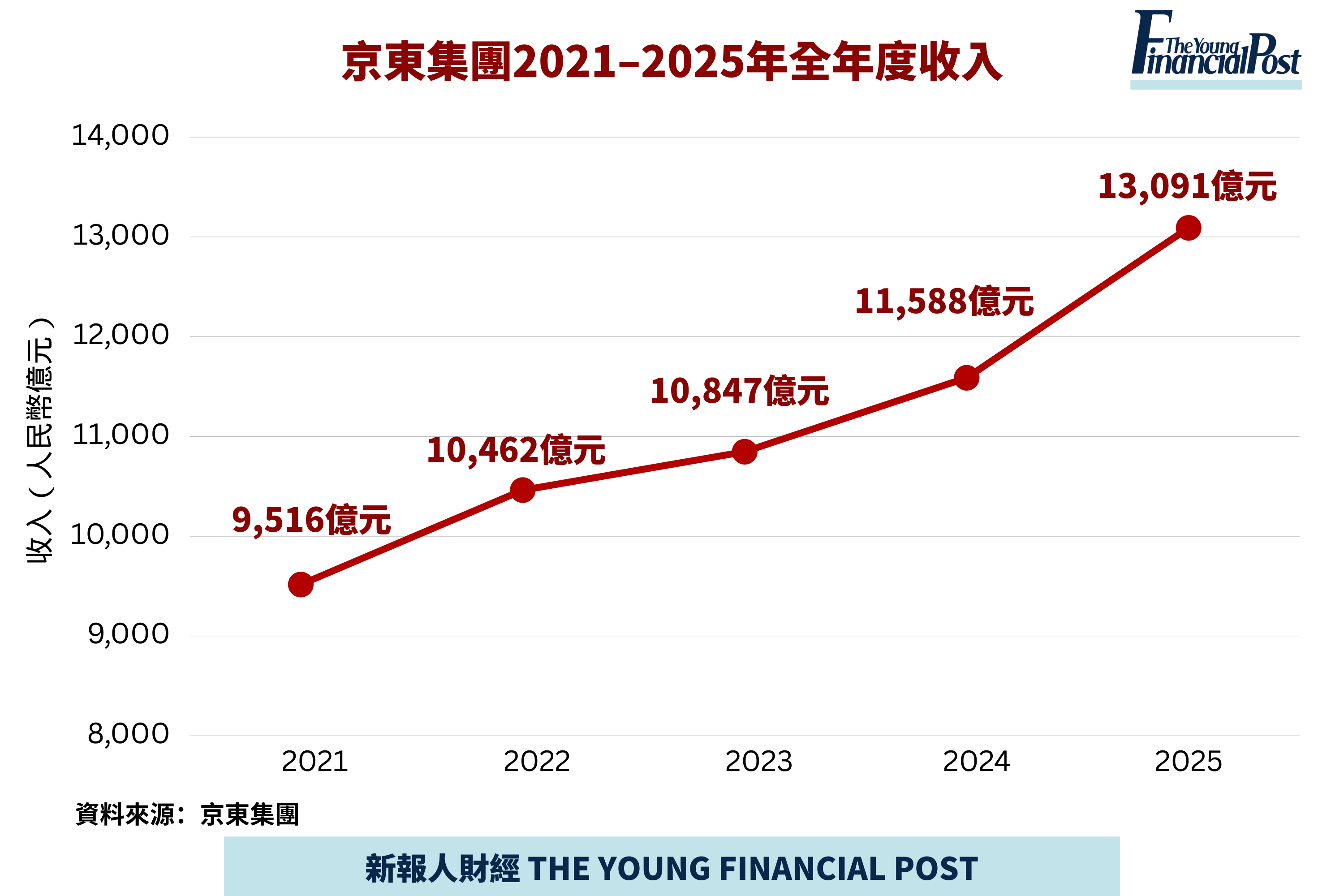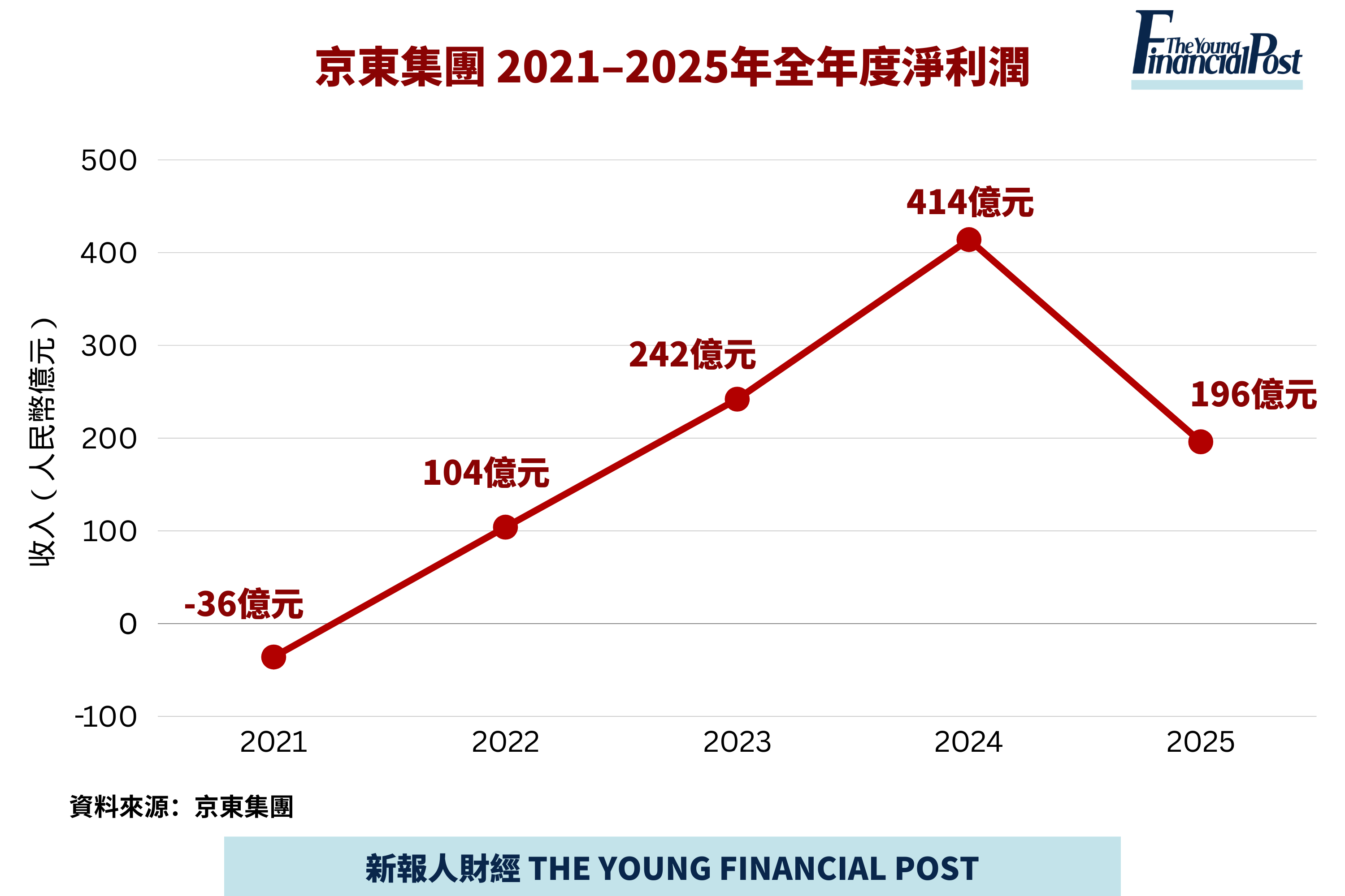 京東集團(9618)昨日(5日)收市後公布2025年第四季度及全年業績。2025全年收入13,091億元人民幣(下同),按年增長13%,淨利潤196億元,按年跌52.7%。單計第四季,收入為3523億元,按年升1.5%,但該季由盈轉虧,淨虧損為27億元,經調整純利為11億元,按年跌逾90%。公司宣佈派發末期息每股50美仙。京東集團首席財務官單甦表示,儘管第四季度業績出現短期波動,但公司財務狀況仍然穩健,符合預期。京東股價今日(6日)上午造好,股價中午收市升逾8%,重上100元以上水平。