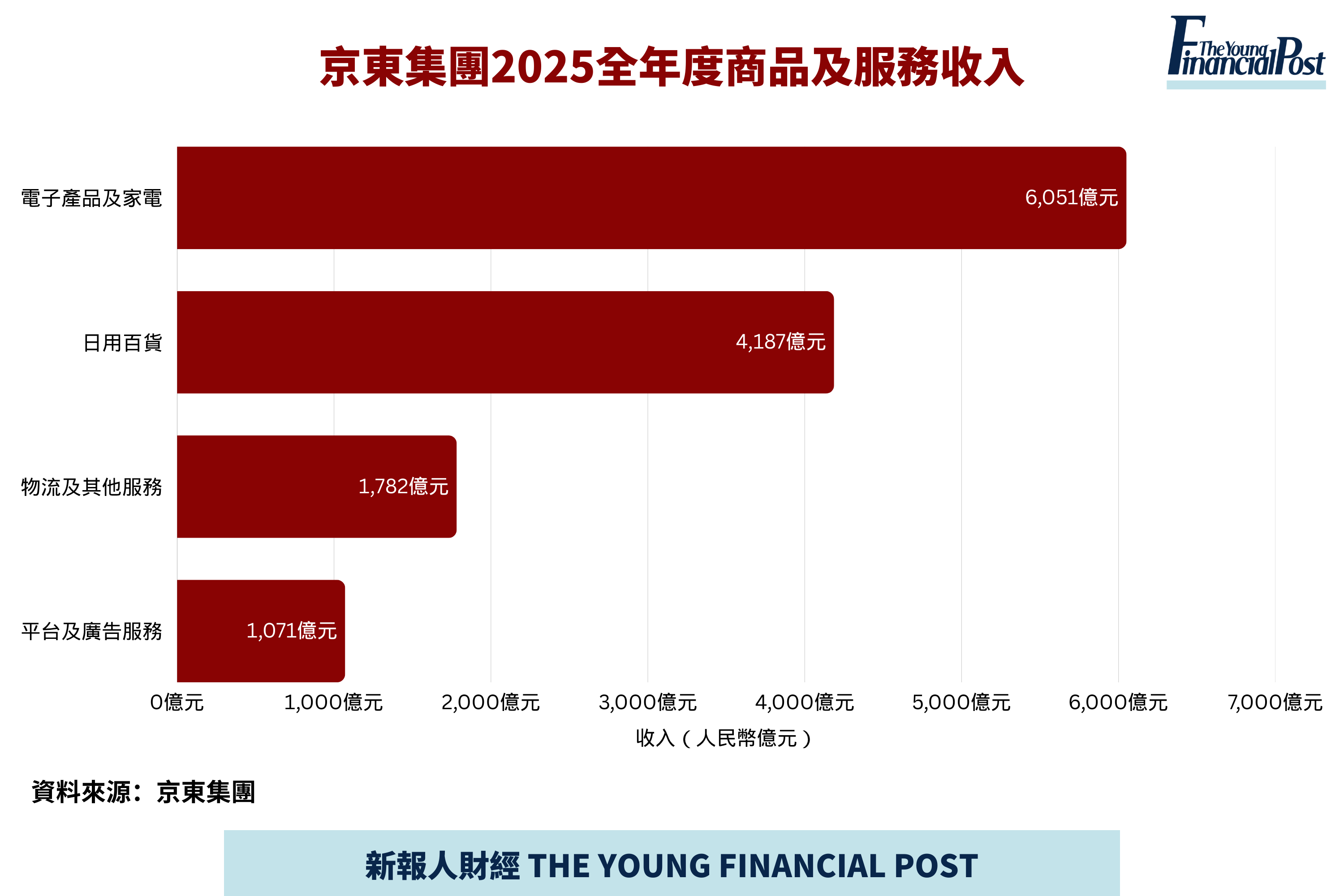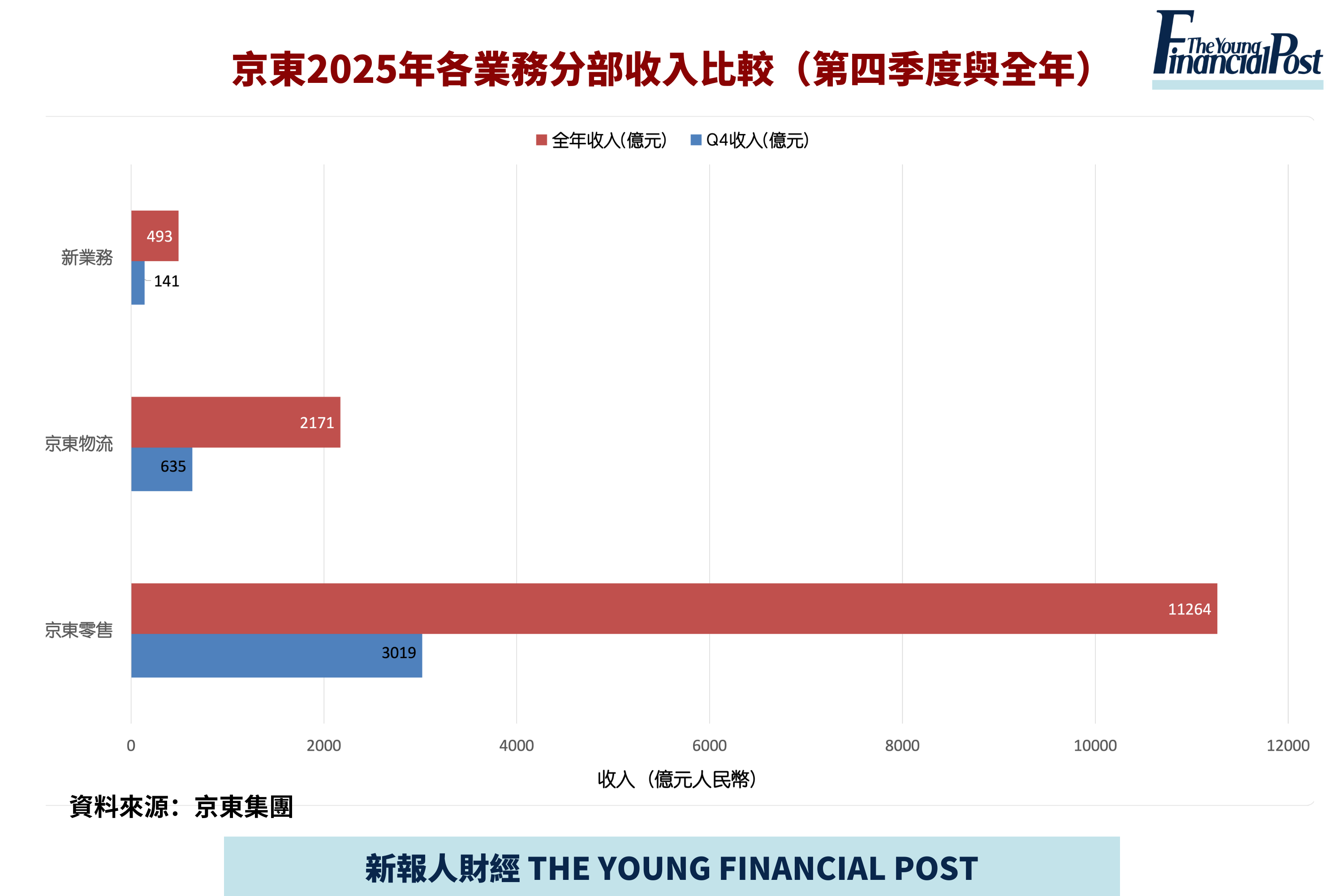 按報告分部劃分,京東零售於2025年第四季度錄得收入3,019億元,按年下跌1.7%,經營利潤為98億元,按年跌2%,全年收入11,264億元,按年增長10.9%,經營利潤514億元,按年增長約25%。京東物流第四季度收入635億元,按年增長21.9%,經營利潤約19億元,按年略升3%;全年收入2,171億元,按年增長18.8%,經營利潤約53億元,按年跌17%。新業務方面,第四季度收入141億元,按年大幅增長約201%,經營虧損擴大至148億元;全年收入493億元,按年增長約157%,全年經營虧損466億元。